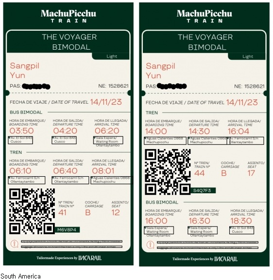 예약 내용은 쿠스코에서 당일 마추픽추 여행을 하는지, 아니면 아구아스 칼리엔테스에서 숙박을 할지에 따라 달라진다. 필자는 쿠스코에서 당일로 다녀오는 일정으로 Inca Rail의 Voyager(Bimodal)서비스를 예매했다. Voyager서비스는 쿠스코에서 오얀따이땀보까지 미니버스로 이동한 후, 오얀따이땀보에서 잉카 레일의 기차를 타고 마추픽추 마을인 아구아스 칼리엔테스로 이동한다. 마추픽추 관람 후, 기차와 미니버스(밴)를 이용하여 당일 쿠스코로 돌아오는 교통편을 제공한다.