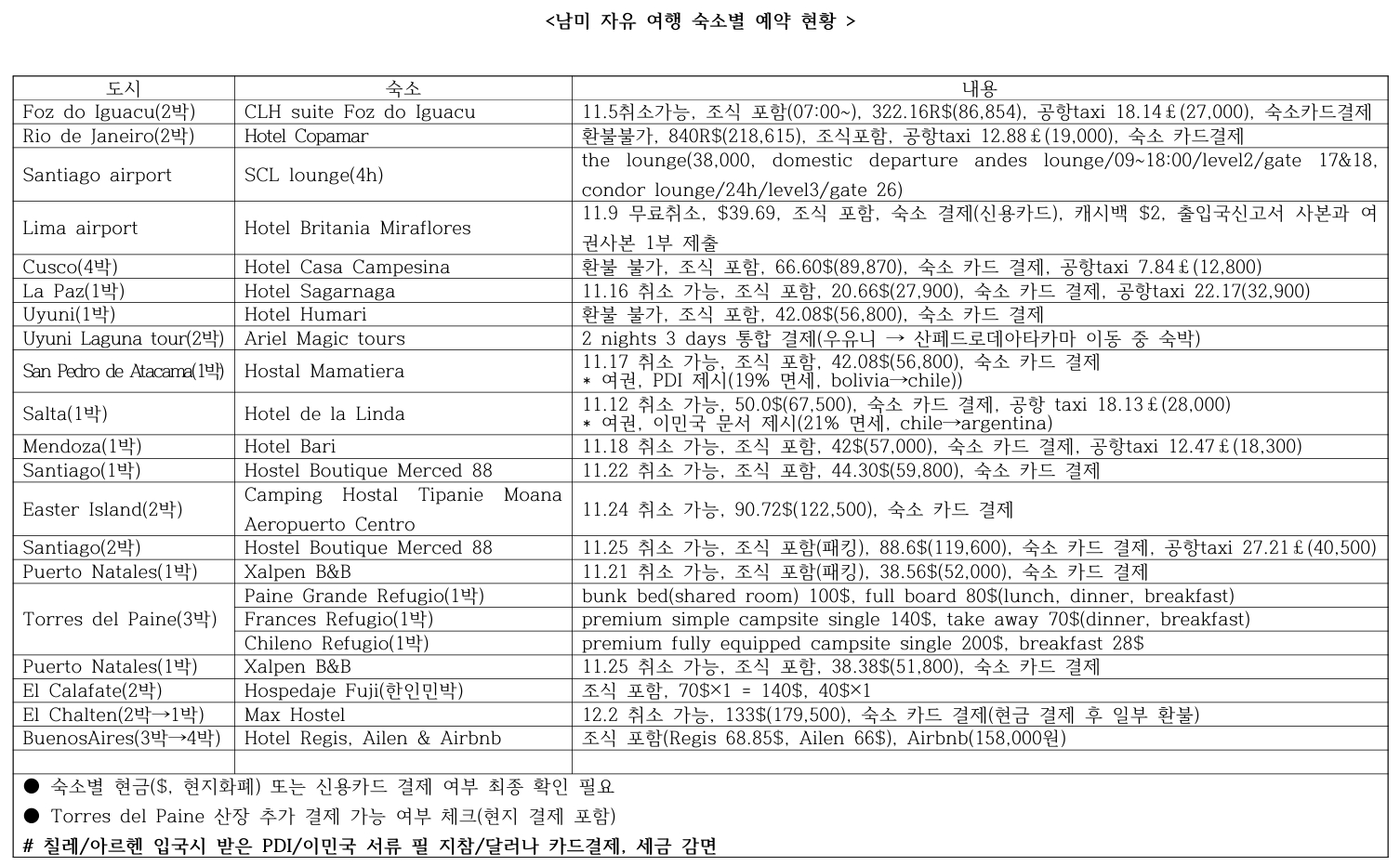 남미 타임을 이해하고 존중해야 한다고 했는데, 여행을 떠나기 전에도 수없이 스케줄 변경 사항이 발생한다. 때문에 장거리 이동 간에는 유사시에 대비하여 앞 뒤 일정에 여유를 갖도록 반영한다. 또 수화물 위탁 조건을 잘 파악하고 있어야 항공 이동시 추가적인 요금 부담에서 벗어난다.