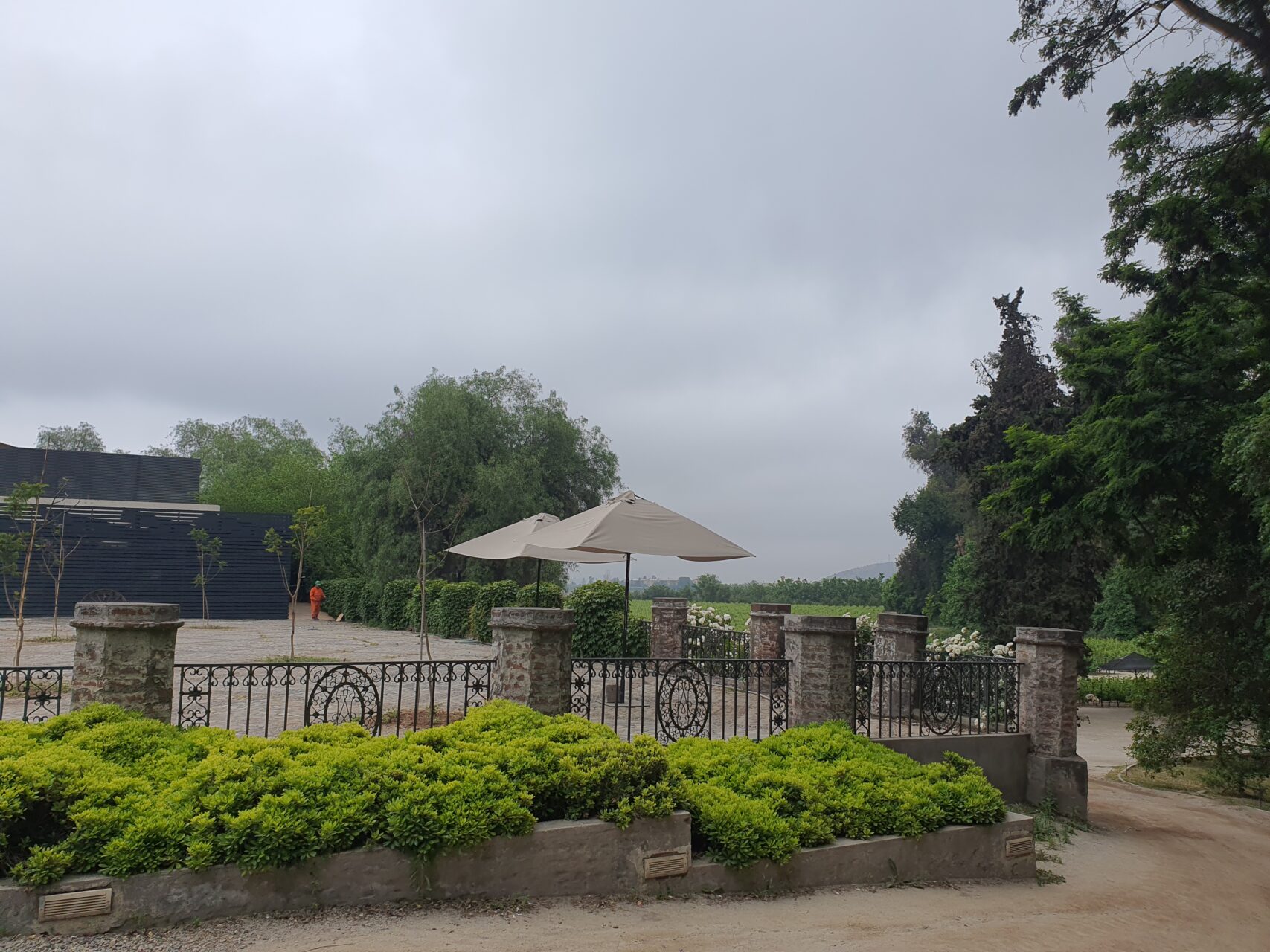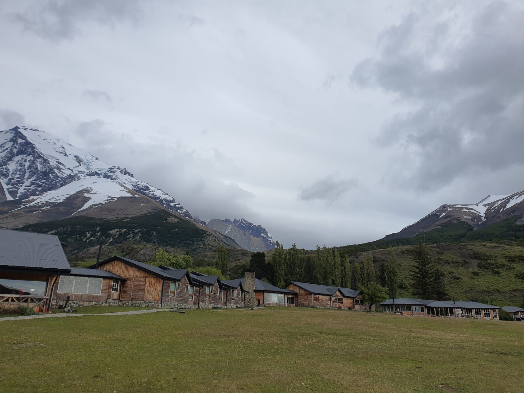 11:08, Welcome Center로 가는 길에 구름 속에 갇힌 토레스 델 파이네를 배경으로 호텔을 담았다.
