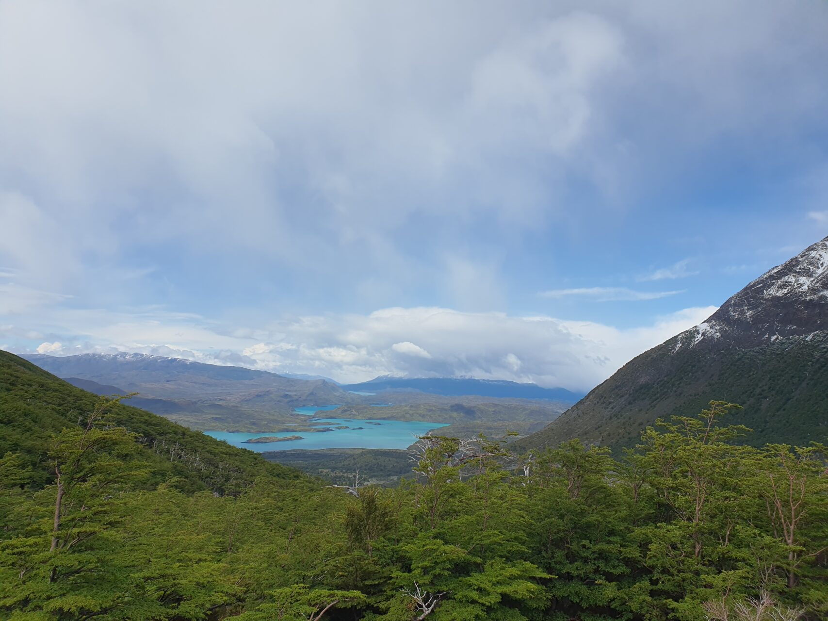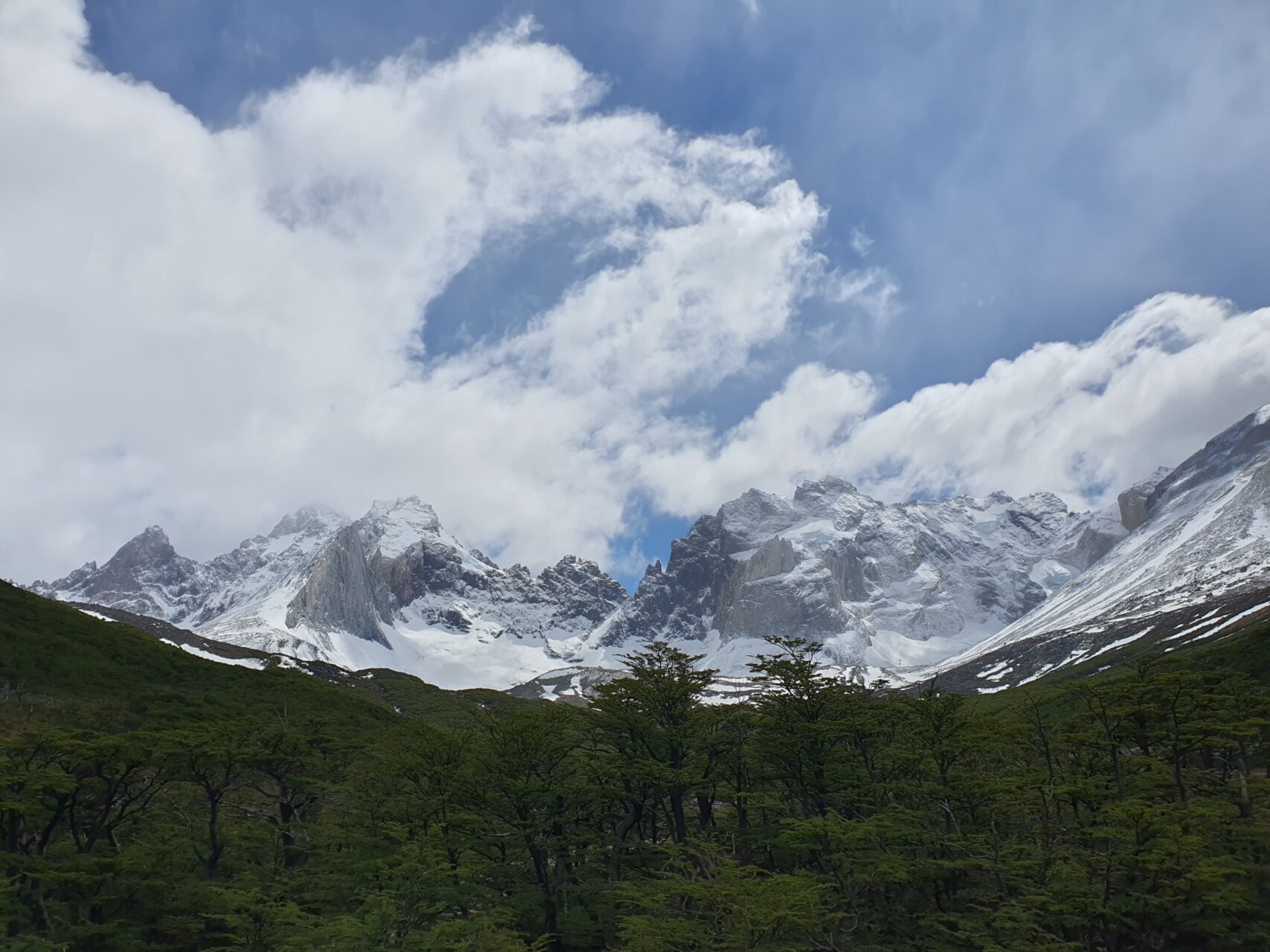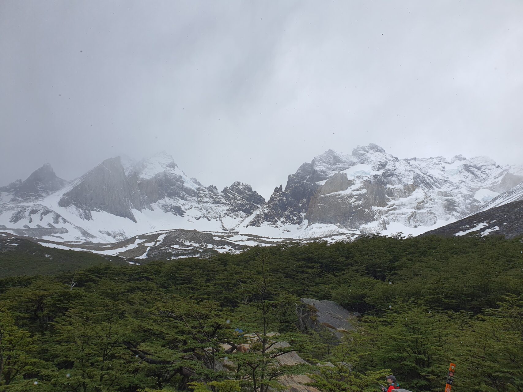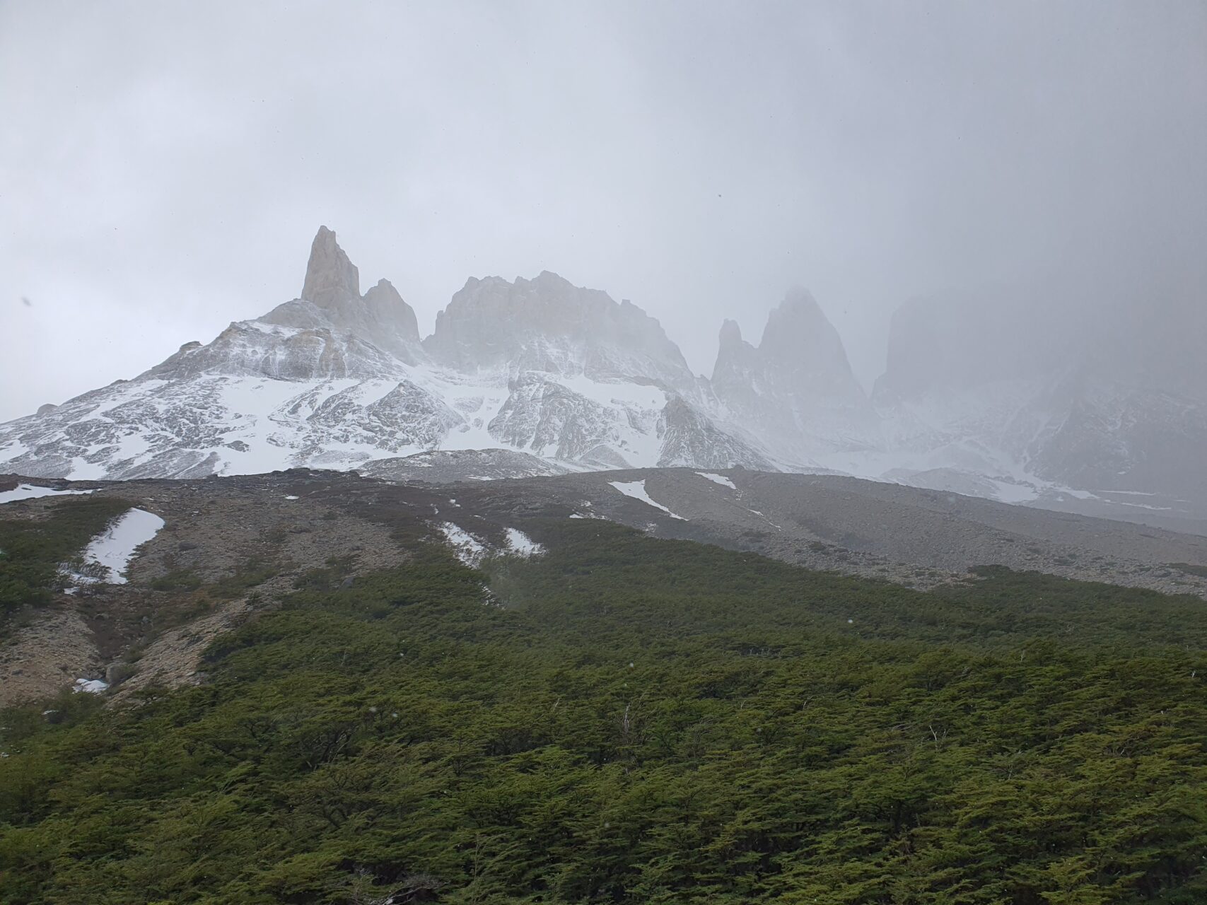 14:25, 눈 덮인 Cordillera del Paine 산군이 여전히구름에 가려있다.