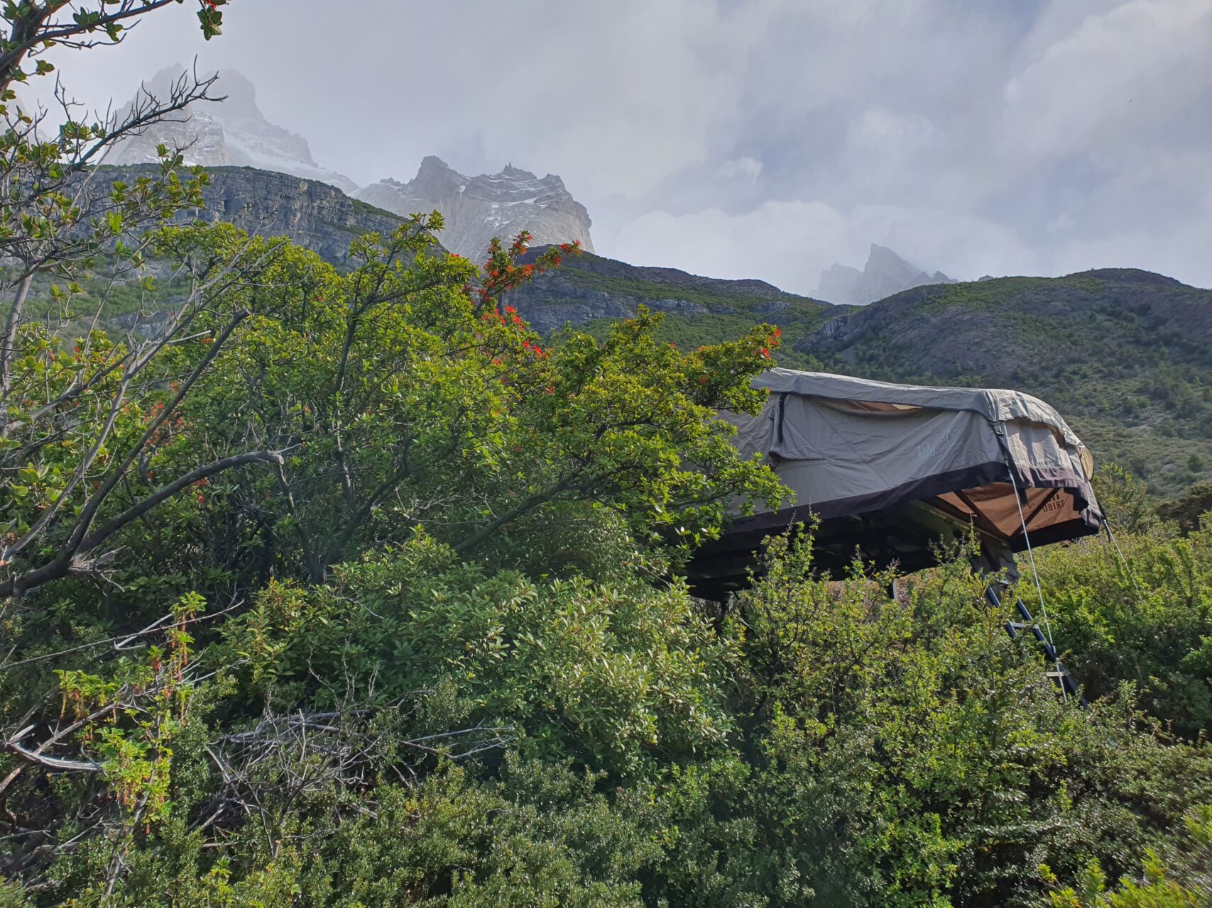 08:09, 산장에 도착하니 토레스 삼봉 중 센트랄과 수르가 살며시 보였다.