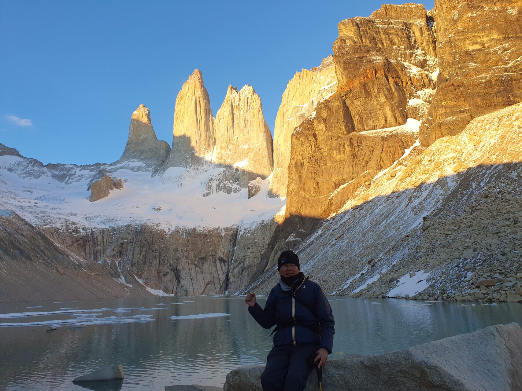 추위 속에서 1시간 이상 머무르며 토레스 삼봉의 장엄한 일출을 보게 된다.